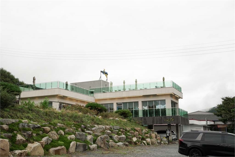 스카이라운지의 풍성한 환대 단양역에서 상진대교 방향으로 이어지는 도로를 따라가면 남한강이 내려다보이는 언덕 위에 가 자리한다. 차로 3분 거리의 가까운 위치, 넓은 주차장, 탁 트인 전망으로 단양 여행자들에게 ‘처음이자 미지막 휴식 공간’으로 꼽히는 곳이다. 이곳은 옛 정미소를 개조해 만들었다. 높은 층고와 목재 구