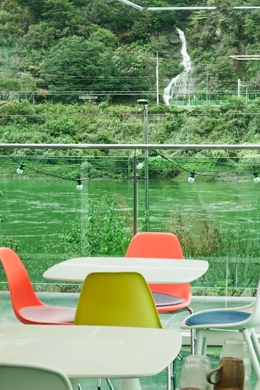리버페리는 남한강이 내려다보이는 자리에 자리한다. 비 오는 날이면 통창 너머로 폭포처럼 물이 흘러내려 이 카페만의 독특한 풍경을 완성한다. 과거 어부의 터였던 이곳은 지금은 사람들의 이야기가 쌓이는 힐링 카페로 변모했다.