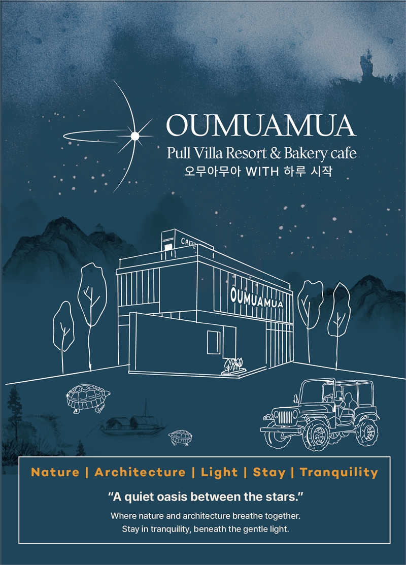 충북 단양군 대강면 사인암로 623, 산과 강이 만나는 곳에 자리한 <오무아무아>가 모습을 드러낸다. 하와이어(Oumuamua)로 ‘멀리서 온 손님’을 뜻하는 이름처럼, 이곳은 여행자에게 낯설지만 따뜻한 ‘머무름의 공간’을 선물한다.